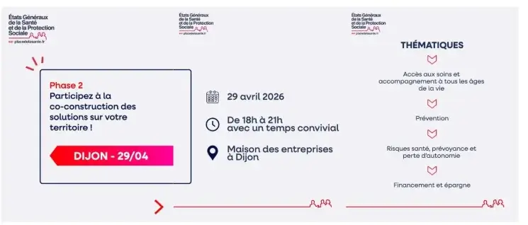 Le 29 avril à Dijon se tiendra le 1er atelier des "États généraux de la santé et de la protection sociale" de la région Bourgogne-Franche-Comté. Il sera dédié aux thématiques de l’accès aux soins et de l’accompagnement à tous les âges de la vie, à la prévention, aux risques santé, prévoyance et perte d’autonomie et au financement et épargne.